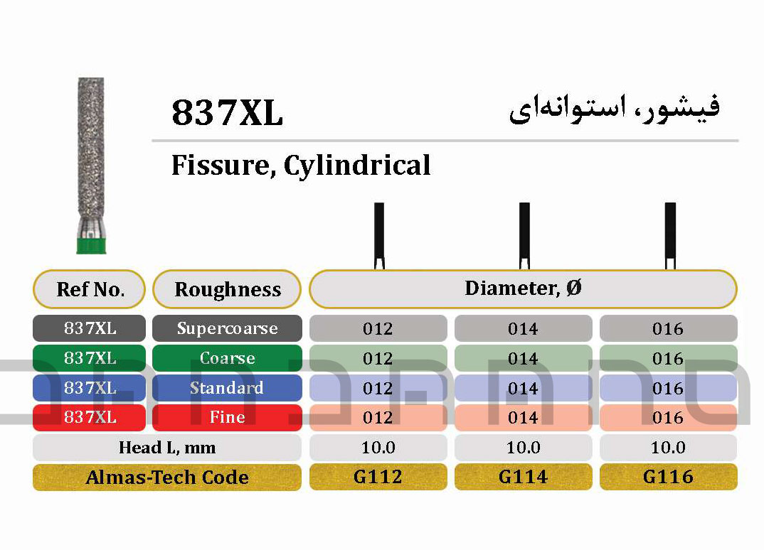 فرز فیشور-استوانه‌ای بلند (Extra Long Flat End Fissure Bur)  که با کد سری ۸۳۷XL شناخته می‌شود، یک ابزار استاندارد برای تراش دیواره‌های محوری با ارتفاع بلند و شکل‌دهی به خط ختم تراش شولدر (Shoulder) است.