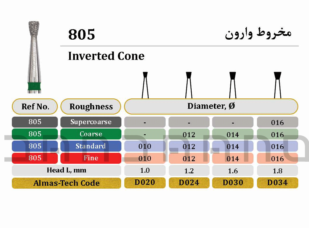 فرز مخروطی- اینورتد (Inverted Cone) ۸۰۵ کاربرد این فرز برای برداشتن سریع پوسیدگیهای عمیق، گسترش سریع حفره، آمادهسازی تاج دندان برای روکش، ایجاد برش در محل اتصال کف پالپ و دیوارههای جانبی میباشد.