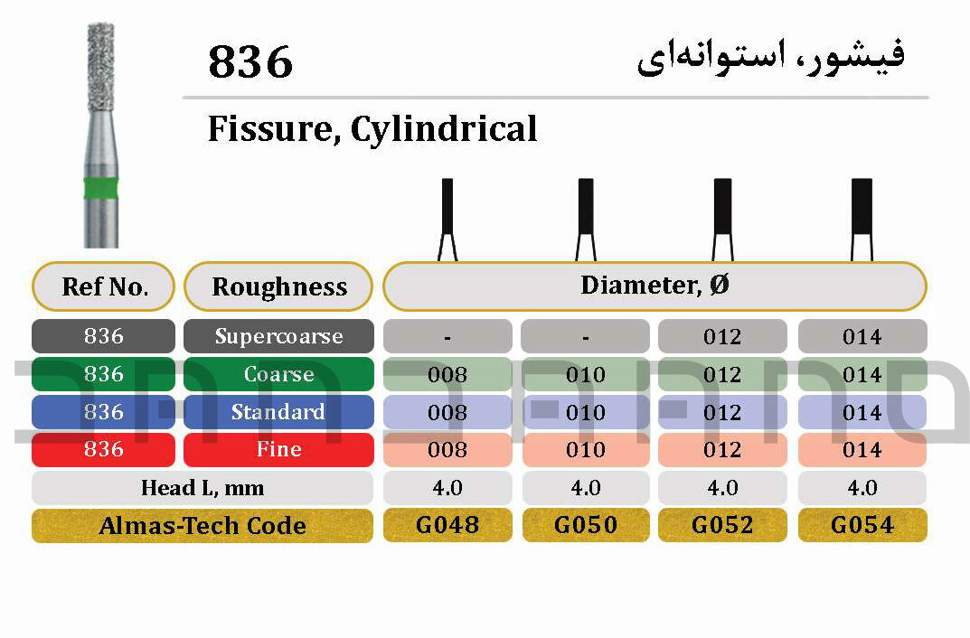 فرز فیشور-استوانهای (Flat End Fissure Bur) که با کد سری ۸۳۶ شناخته میشود (احتمالاً با قطر کوچکتر نسبت به ۸۳۷)، یک ابزار استاندارد برای تراش اصلی دیوارههای محوری و ایجاد خط ختم تراش شولدر (Shoulder) در دندانهای کوچکتر است.
