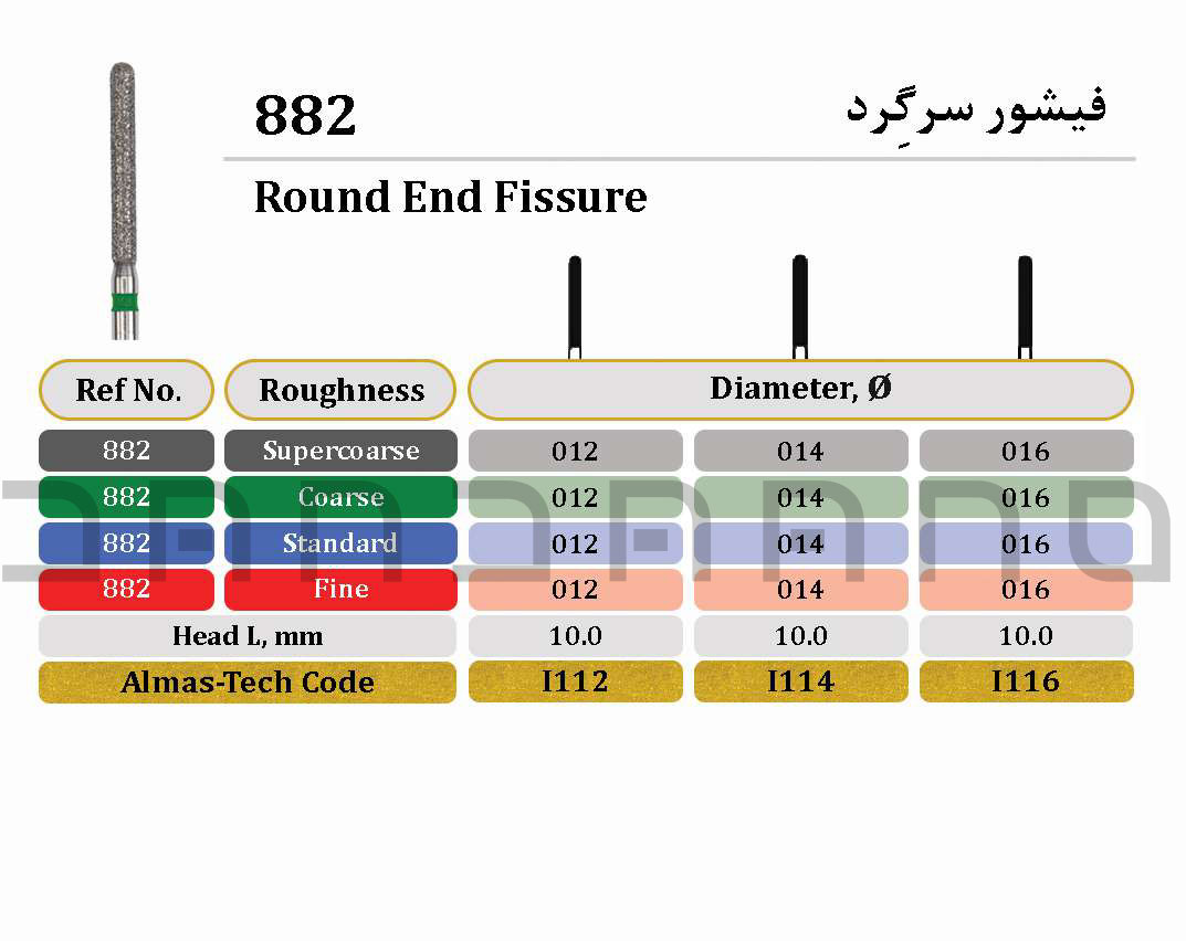 فرز فیشور سر گرد (Round End Fissure Bur) ب با کد سری ۸۸۲ شناخته می‌شود. این ابزار، فرز استاندارد برای تراش دیواره‌های محوری و آماده‌سازی حفره با دقت و سرعت مناسب است.
