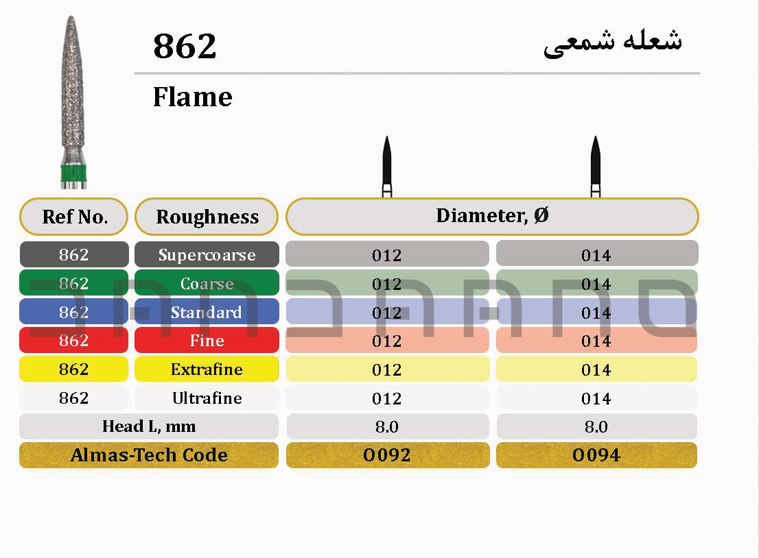 فرز شعله شمعی (Flame/Candle Bur) با گریت خیلی ریز (Extra Fine) و دور زرد، که با کد سری 862 شناخته میشود (احتمالاً با ابعاد کوچکتر نسبت به 863)، ابزاری است برای پولیش نهایی و کانتورینگ ظریف مارجینها و سطوح در نواحی دقیقتر.