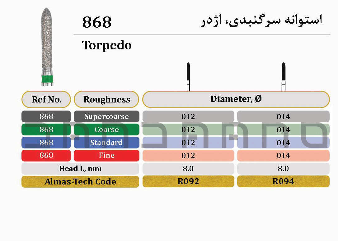 فرز تورپیدو-استوانه‌ای (Cylinder Torpedo) با گریت زبر (Coarse) و دور سبز، که با کد سری 868 شناخته می‌شود، یک ابزار استاندارد و اصلی برای تراش سریع و موازی‌سازی دیواره‌های محوری دندان در آماده‌سازی‌های پروتزی است.